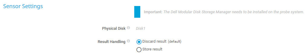 This sensor requires Dell Modular Disk Storage Manager on the probe system. You must install it on the probe system (on every cluster node, if on a cluster probe). For details about setup, see section More below.