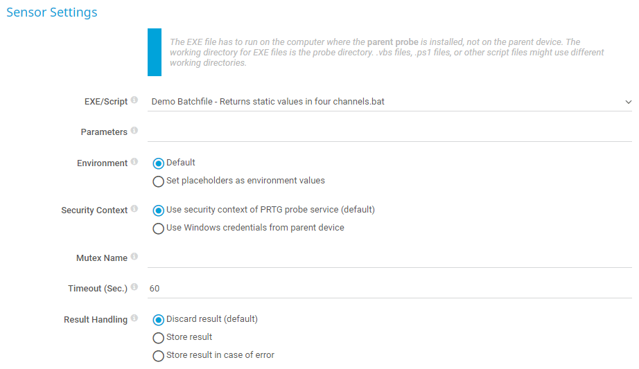 The EXE/Script Advanced sensor runs an executable file (.exe) or a script (batch file, VBScript, PowerShell) on the probe system. This option is available as part of the PRTG API.