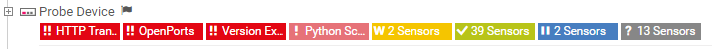 This element is visible when you view a probe, a group (including the root group), or a device. It is not available on the Overview tab of a sensor. The sensor status bar shows the accumulated states of all sensors for the selected object, grouped into different sensor states. They show the number of sensors that are in the respective status.