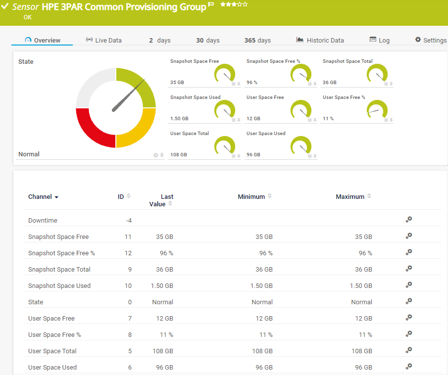 The HPE 3PAR Common Provisioning Group sensor monitors the capacity of a Common Provisioning Group (CPG) on an HPE 3PAR storage system.