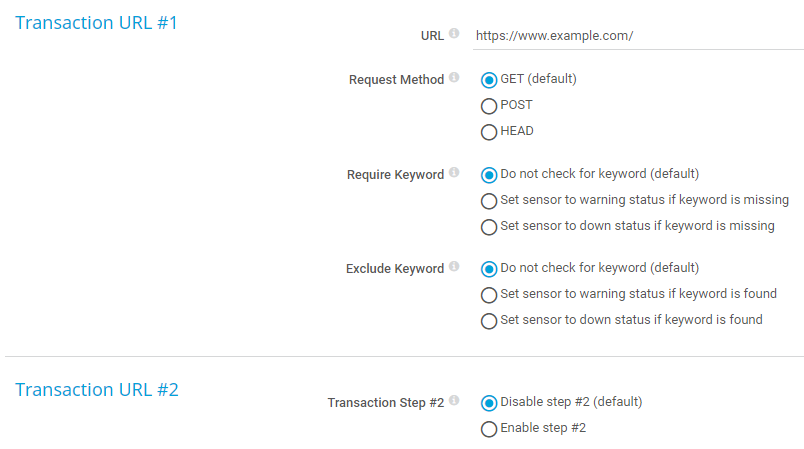 You can define up to 10 different transaction URLs, which are all called in a row. If the transaction can be completed, the sensor shows the Up status. Using this mechanism, you can set up extended monitoring with multiple URLs.