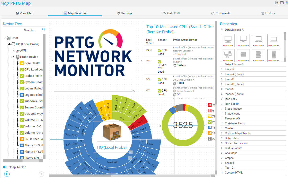 Choose from various icons that represent typical network devices in the style of the PRTG web interface. Default icons from category A also display object data. You can see the object name and a sensor overview for the object. This indicates how many sensors show a specific status. For some sensors, a mini graph is shown as well.