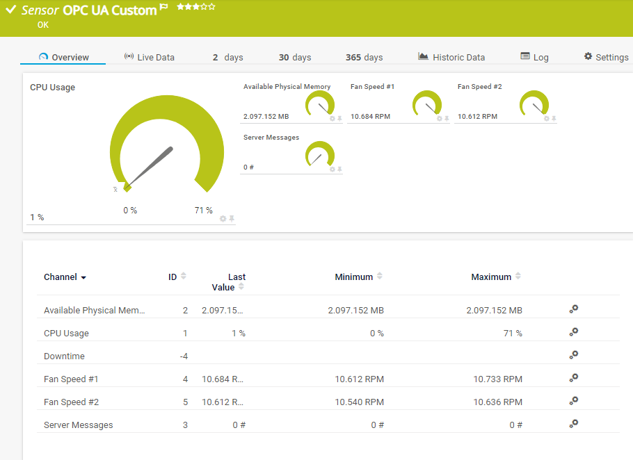 The OPC UA Custom sensor monitors up to ten numeric values returned by specific OPC Unified Architecture (OPC UA) NodeIDs.