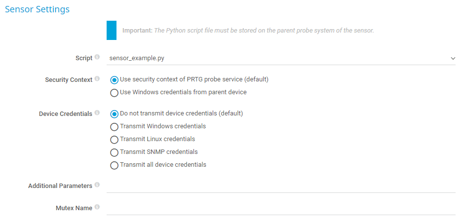 PRTG adds the device credentials to the JSON object that is passed to the script as a command-line parameter. Define if you want to transmit device credentials to the Python script: