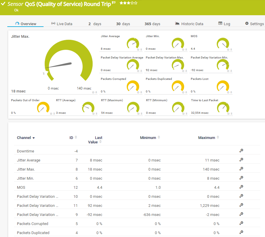 The QoS (Quality of Service) Round Trip sensor monitors parameters regarding the quality of a network connection between two probes.