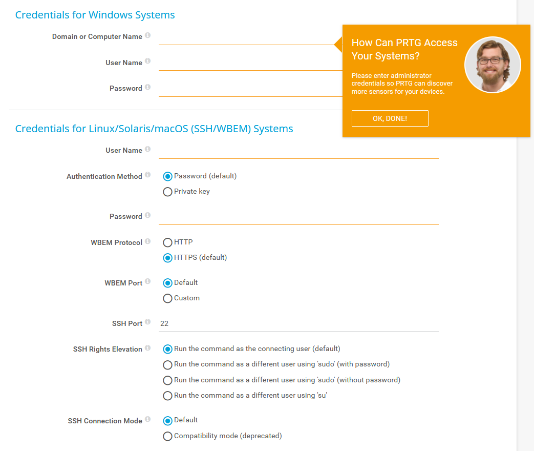 • If you have systems that run on Linux, Solaris, or macOS, enter root access credentials for these systems. For a general introduction to Secure Shell (SSH) monitoring, see section Monitoring via SSH.